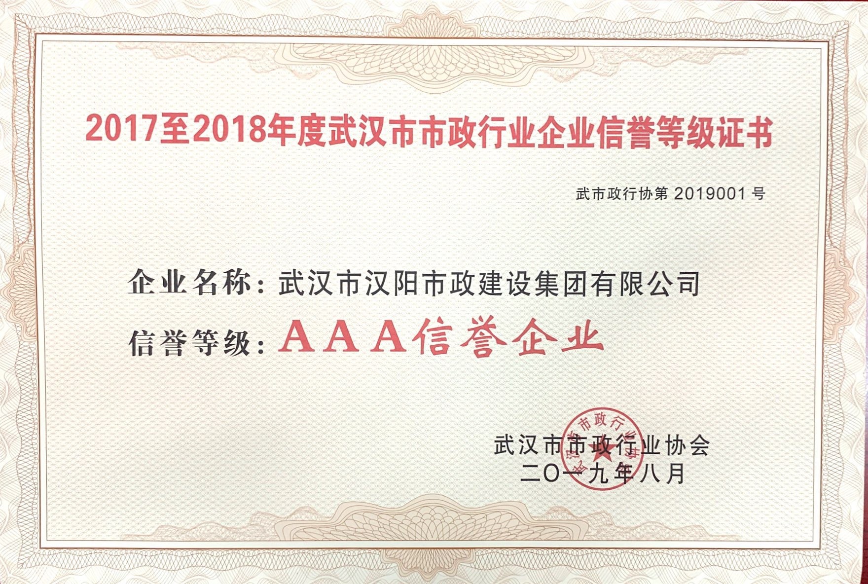 武漢市市政行業(yè)企業(yè)信譽(yù)等級(jí)證書(shū)