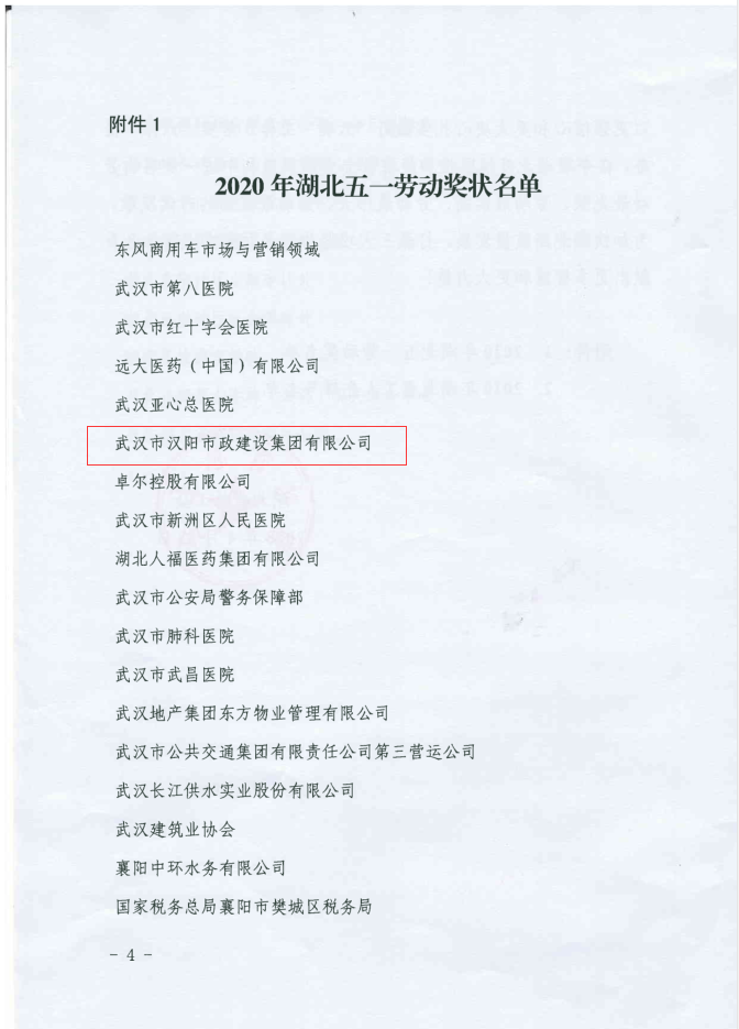 4月27日,湖北省總工會(huì)發(fā)布《關(guān)于表彰2020年湖北五一勞動(dòng)獎(jiǎng)和湖北省工人先鋒號(hào)的決定》(鄂工發(fā)〔2020〕10號(hào)),武漢市漢陽市政建設(shè)集團(tuán)有限公司榮獲2020年湖北五一勞動(dòng)獎(jiǎng)狀榮譽(yù)。