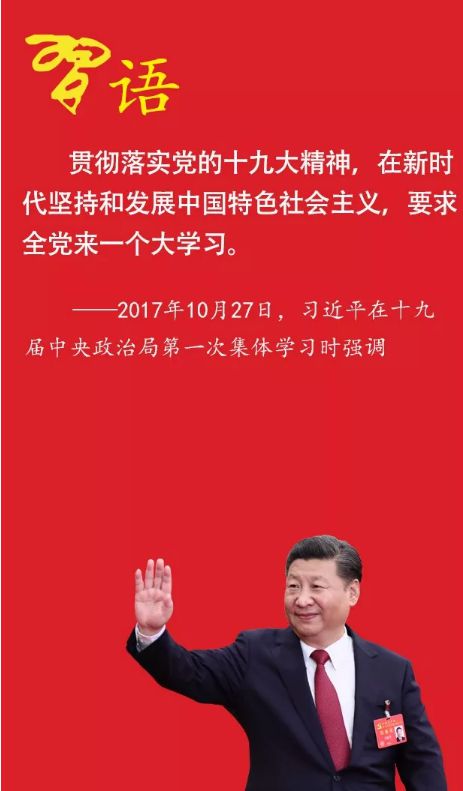 習近平新時代中國特色社會主義思想是貫穿黨的十九大精神的主線和靈魂。習近平新時代中國特色社會主義思想中的思想觀點,在理論上有重大突破、重大創(chuàng)新、重大發(fā)展,深刻揭示了新時代中國特色社會主義的本質特征、發(fā)展規(guī)律和建設路徑,為在新的時代條件下堅持和發(fā)展中國特色社會主義提供了科學的理論指引。因此,在全黨來一個大學習,首先要學習好貫徹好這一思想,這是一項重大政治任務,不是一般的理論學習、業(yè)務學習,而是政治學習、看齊學習。要深入學習領會這一思想的時代背景、精神實質、豐富內涵和實踐要求,深入領會貫穿其中的堅定信仰信念、鮮明人民立場、強烈歷史擔當、求真務實作風、勇于創(chuàng)新精神和科學方法論,深入領會這一思想的重大政治意義、理論意義、實踐意義,不斷增強政治意識、大局意識、核心意識、看齊意識,不斷增強政治認同、思想認同、理論認同、情感認同,切實把思想和行動統(tǒng)一到習近平新時代中國特色社會主義思想上來,把學習的成效轉化為維護核心、看齊中央的政治自覺,轉化為改造主觀世界、錘煉堅強黨性的思想自覺,轉化為指導實踐、推動工作的行動自覺,堅決維護習近平總書記這個核心、維護黨中央集中統(tǒng)一領導,在思想上政治上行動上同以習近平同志為核心的黨中央保持高度一致。