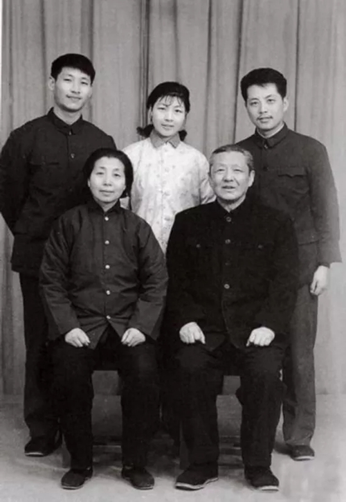 △1975年,習(xí)仲勛和齊心與兒女在洛陽紅旗照相館合影。后排左起:兒子習(xí)近平、女兒習(xí)安安、女婿吳龍。來源:《習(xí)仲勛畫傳》