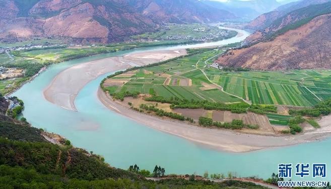 云南省麗江市石鼓鎮(zhèn)綠樹(shù)和農(nóng)田掩映下的“長(zhǎng)江第一灣”(來(lái)源:新華網(wǎng))