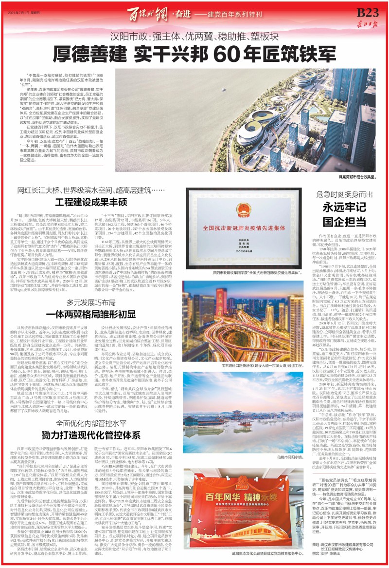 7月1日,長(zhǎng)江日?qǐng)?bào)專版報(bào)道漢陽(yáng)市政,推出《厚德善建 實(shí)干興邦 60年匠筑鐵軍——漢陽(yáng)市政:強(qiáng)主體、優(yōu)兩翼、穩(wěn)助推、塑板塊》專版報(bào)道,聚焦?jié)h陽(yáng)市政發(fā)展史,展現(xiàn)漢陽(yáng)市政為城市發(fā)展做出的貢獻(xiàn)。