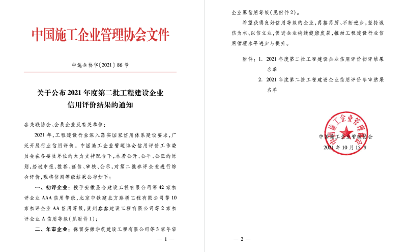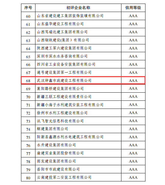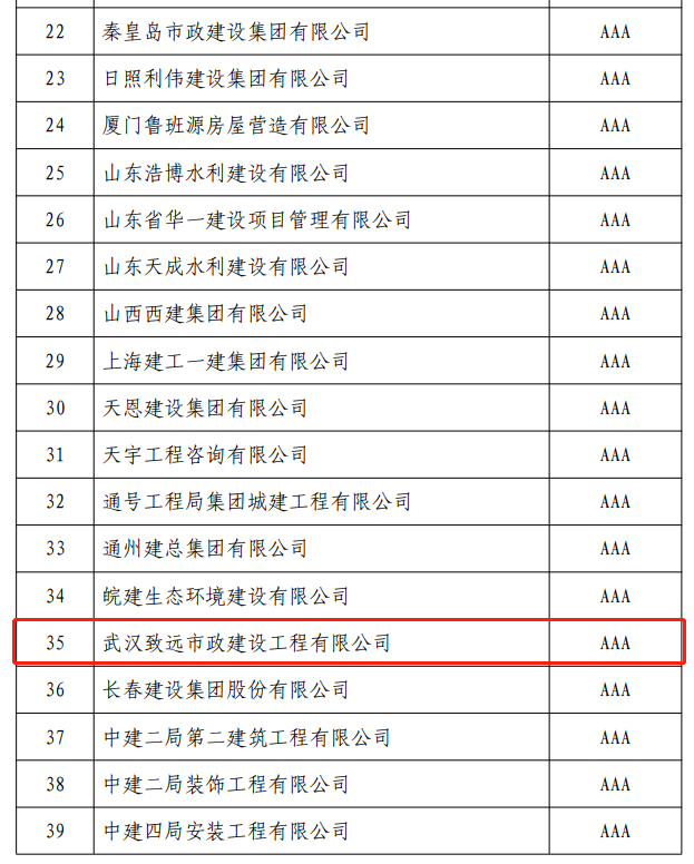 近日,中國施工企業(yè)管理協(xié)會發(fā)布,2021年度第一批、第二批工程建設企業(yè)信用評價結(jié)果名單漢陽市政鐘鑫公司、致遠公司榮獲信用等級AAA級。截止目前,漢陽市政及旗下共有5家企業(yè)獲此榮譽。