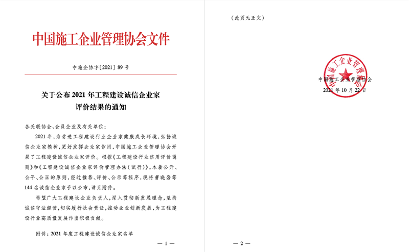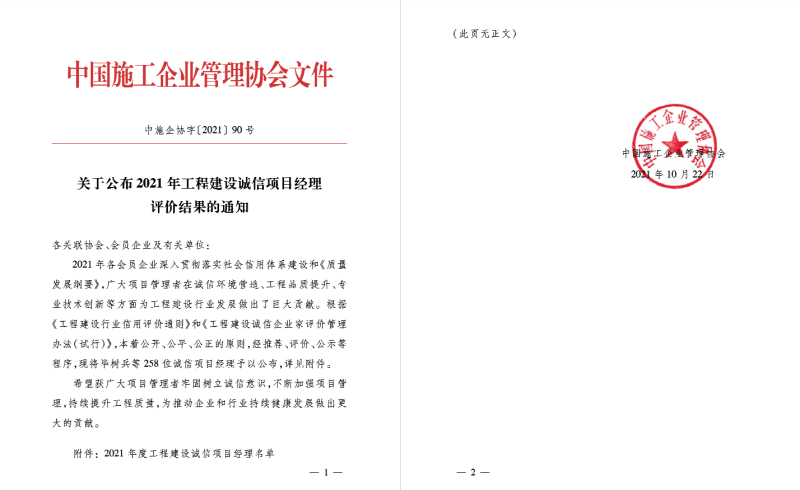 近日,中國施工企業(yè)管理協(xié)會傳來好消息,漢陽市政黨委書記、董事長嚴悌文榮獲“2021年工程建設(shè)誠信企業(yè)家”,漢陽市政七公司總工程師羅艷明榮獲“2021年工程建設(shè)誠信項目經(jīng)理”。