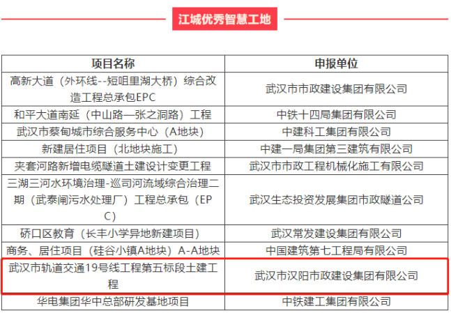 近日,由楚天都市報、武漢建筑業(yè)協(xié)會、武漢市建筑行業(yè)工會聯(lián)合會聯(lián)合主辦的2021年“創(chuàng)領(lǐng)智控杯”江城“雙十大”選樹結(jié)果揭曉,漢陽市政高新三路(三環(huán)線-外環(huán)線)改造提升工程總承包(EPC)獲評“江城十大智慧工地”,創(chuàng)智路、徑河路、徑河五路、徑河五路跨徑河橋、黃獅海東路工程總承包(EPC)獲評“江城文明工地”,武漢市軌道交通19號線工程第五標段土建工程獲評“江城優(yōu)秀智慧工地”。