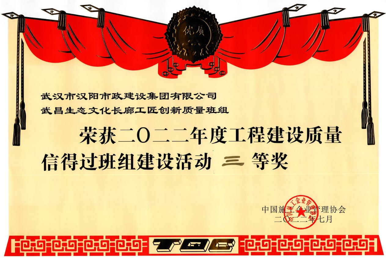 近日,中國施工企業(yè)管理協(xié)會公布了2022年工程建設(shè)優(yōu)秀質(zhì)量信得過班組名單,漢陽市政首次參加此類活動,申報的3個成果均獲得獎項。其中,三公司“武漢博宏建設(shè)集團有限公司裝修班組”和七公司“當(dāng)陽沮河一橋?qū)嵏山ㄔO(shè)班組”榮獲二等班組獎項;二公司“武昌生態(tài)文化長廊工匠創(chuàng)新質(zhì)量班組”榮獲三等班組獎項。
