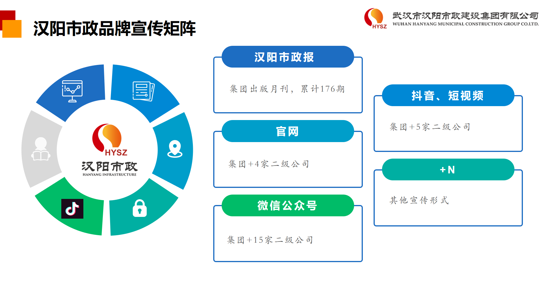 長期以來,公司品牌文化建設(shè)工作推陳出新,漢陽市政報、官方網(wǎng)站、微信公眾號、抖音企業(yè)號、微信視頻號“5+N”傳播矩陣持續(xù)夯實,現(xiàn)已形成“1+15”的微信矩陣,“1+4”網(wǎng)站矩陣和“1+5”的抖音矩陣。集團《漢陽市政報》連續(xù)四年獲評中施企協(xié)精品報刊;集團微信公眾號獲評中施企協(xié)精品公眾號、全國建筑業(yè)優(yōu)秀微信公眾號、湖北省建筑行業(yè)優(yōu)秀公眾號、湖北十佳政務(wù)新媒體(城建);集團官方網(wǎng)站獲評中施企協(xié)精品網(wǎng)站,訪問量持續(xù)增長,品牌傳播力度不斷加強。