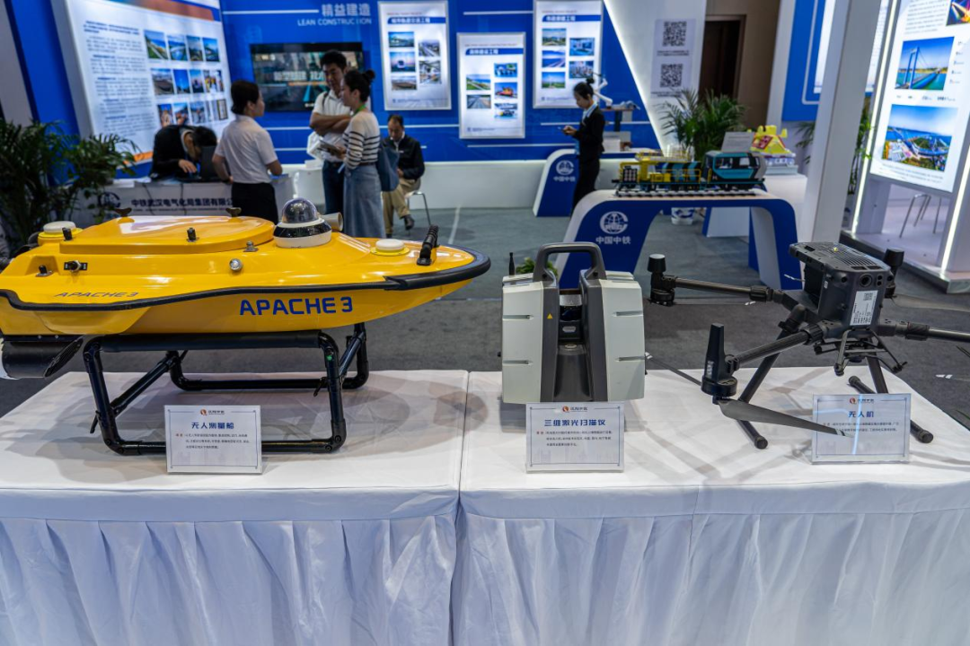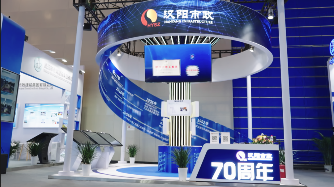 漢陽(yáng)市政展區(qū)以綠色建造、智能建造為主題,分享集團(tuán)數(shù)字化轉(zhuǎn)型的成果。本次展覽告別傳統(tǒng)展陳形式,以漢陽(yáng)樹(shù)為靈感,樹(shù)冠處連接飄帶,增添靈動(dòng)感,大面積采用科技藍(lán)、白色來(lái)點(diǎn)綴,營(yíng)造不一樣的活力氛圍。展區(qū)以漢陽(yáng)樹(shù)為中心,展示了公司70年發(fā)展歷程、取得的重點(diǎn)業(yè)績(jī)和榮譽(yù)獎(jiǎng)項(xiàng)、聯(lián)合體工作、綠色技術(shù)、綠色產(chǎn)業(yè),以及企業(yè)數(shù)字化轉(zhuǎn)型、CIM基礎(chǔ)平臺(tái)建設(shè)等內(nèi)容。
