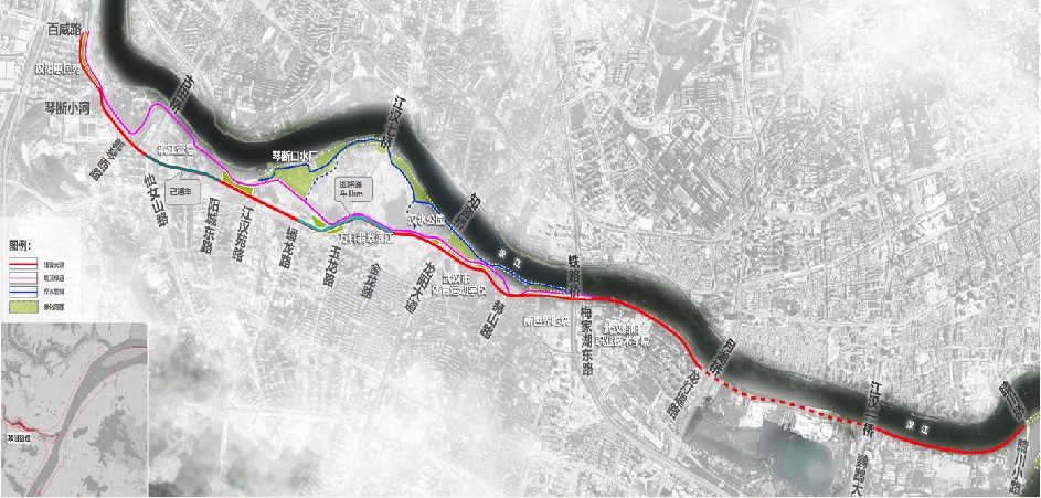 漢江南岸綜合治理工程EPC項(xiàng)目主要建設(shè)內(nèi)容為知音大道提升改造和漢水碧道建設(shè),項(xiàng)目估算總投資38.33億元。知音大道改造提升工程包含百威路至龍燈堤路段、江漢一橋至晴川小路段,道路長(zhǎng)約9.5km,紅線寬25至35m,雙向4車(chē)道,部分路段道路與堤防局部結(jié)合,采用橋梁形式上跨琴斷口小河,通道形式下穿龍陽(yáng)大道和京廣鐵路;新建和改造防汛道路約6.39km,并進(jìn)行路堤加固、防滲和防護(hù)處理,同步建設(shè)排水、交通、照明、綠化等配套設(shè)施。