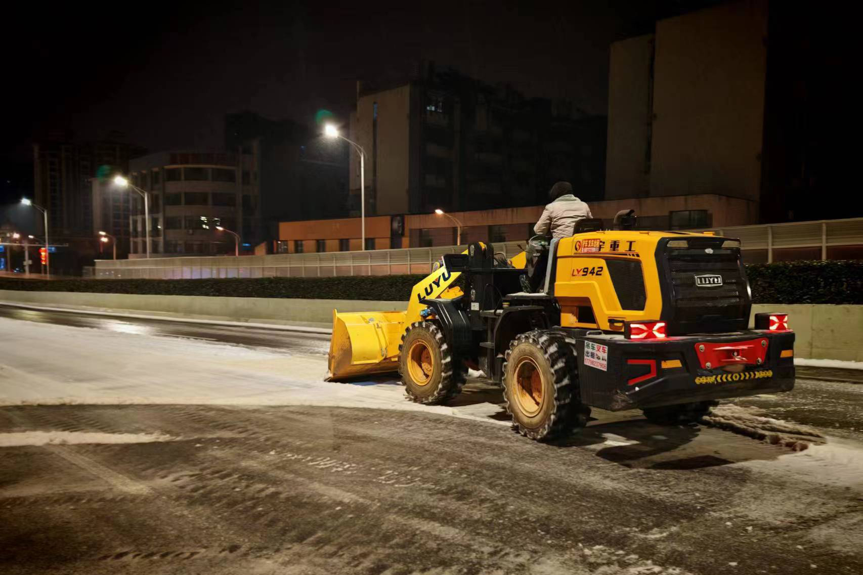 24小時不間斷,漢陽市政融雪除冰應(yīng)急搶險突擊隊(duì)通宵奮戰(zhàn),積極投身到保暢保通工作當(dāng)中,駕駛?cè)谘﹦┤霾架?、鏟車在路面循環(huán)作業(yè),在漢陽大道、江城大道、晴川大道、鸚鵡大道、國博大道、墨水湖北路、琴臺大道、楊泗港、龍陽大道、仙女山高架、二環(huán)線高架等重點(diǎn)區(qū)域,通過“人機(jī)聯(lián)合作戰(zhàn)”的作業(yè)模式,頂風(fēng)鏟雪,保障城市交通暢通;雪中送炭,幫助受困車輛脫險。同時,應(yīng)急人員積極幫助小區(qū)鏟雪,全力保障市民出行安全。